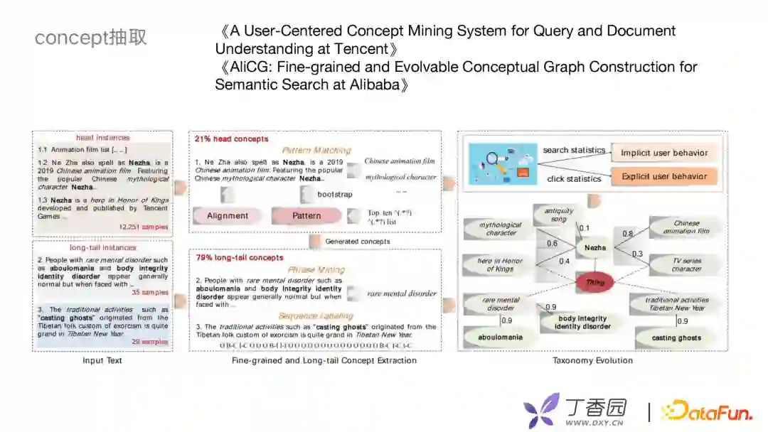 构建概念图谱首先要解决两个问题,第一个问题是如何抽取concept,第二个问题是如何构建concept之间的层级关系,这里借鉴了两篇论文,分别是腾讯的《A User-Centered Concept Mining System for Query and Document Understanding at Tencent》和阿里的《AliCG: Fine-grained and Evolvable Conceptual Graph Construction for Semantic Search at Alibaba》。 在实体抽取方面,主要分为头部和尾部两部分。头部的instance,由于头部的文章内容丰富,可以用模板去识别。长尾部一直都是比较难的问题,可以通过Phrase Mining,或者数据标注的方式解决。如何构建概念间的层次关系?可以通过用户的搜索点击行为去计算文章和概念的关联程度,根据关联程度判断概念之间的层级。