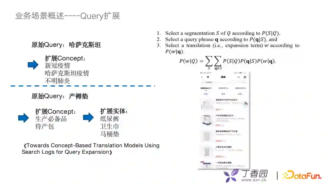 第一种,利用query词和document词的相关性去构建一个贝叶斯模型,扩展的结果是document词或document中出现的一些词组,帮助在召回阶段扩大潜在用户想要的那些文本。 第二种,把它作为一种翻译模型,思路是从query词翻译到document词。早期比较朴素的方案是用一个EM算法去找两类词的对齐关系。现在新的方案都是上神经网络去train一个生成模型来做这个工作。 有了concept层之后,用一些很简单的策略就能有不错的效果,比如我们会直接使用相关性的方式,也就是第一类方法去建模,就可以把原始query向concept层上扩展。比如,“哈萨克斯坦”可以扩展出“新冠疫情”或“不明肺炎”;同样,在电商场景下,我们可以利用扩展的concept和其他的实体关系做二级扩展,比如“产褥垫”可以扩展出“待产包”,然后再从待产包扩展出“卫生巾”“纸尿裤”。这样的应用也带了一点推荐的意思。