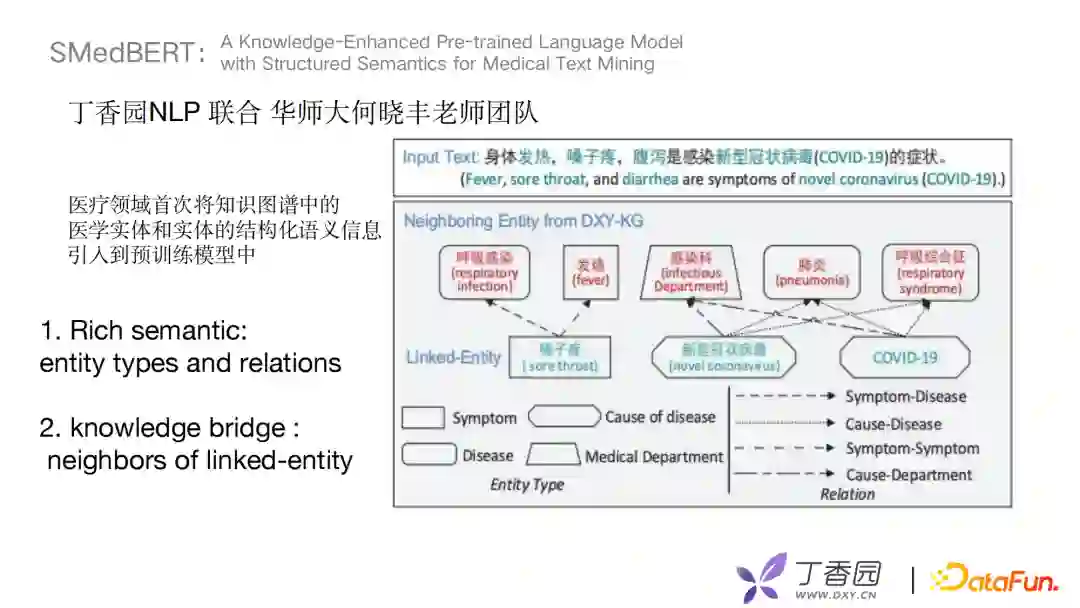接下来介绍去年丁香园NLP组联合华师大何晓丰老师团队在ACL发表的文章《A Knowledge-Enhanced Pre-trained Language Model with Structured Semantics for Medical Text Mining》。这篇文章在医疗垂直领域下首次将知识图谱的医学实体和实体的结构化语义信息引入到预训练模型中。