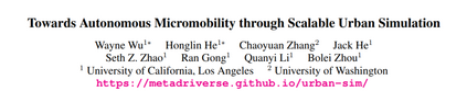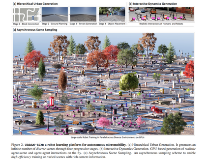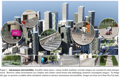 微型出行(Micromobility)是指使用轻量化的移动设备在城市公共空间中移动,例如配送机器人和电动代步车。它正逐渐成为传统机动车出行的有前景替代方案。目前的微型出行设备主要依赖人工操作(包括现场或远程控制),在面对充满不可预测障碍物与行人的繁忙城市环境时,存在安全性与效率方面的明显问题。利用人工智能智能体协助人类操控微型出行设备,为提升出行的安全性与效率提供了一种可行方案。 在本研究中,我们提出了一种可扩展城市仿真解决方案,以推进自主微型出行的发展。首先,我们构建了 URBAN-SIM ——一个高性能机器人学习平台,支持在交互式城市场景中对具身智能体进行大规模训练。URBAN-SIM 包含三个关键模块: 1. 分层式城市生成流程(Hierarchical Urban Generation pipeline), 1. 交互动态生成策略(Interactive Dynamics Generation strategy), 1. 异步场景采样机制(Asynchronous Scene Sampling scheme), 这些模块共同提升了机器人学习过程中仿真环境的多样性、真实性与训练效率。