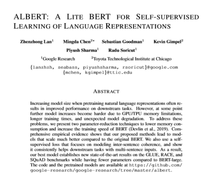 预先训练自然语言表示时,增加模型大小可改善下游任务的性能。 但是,由于GPU / TPU内存的限制,更长的训练时间以及意外的模型降级,在某些时候,进一步的模型增加变得更加困难。 为了解决这些问题,我们提出了两种参数减少技术,以降低内存消耗并提高BERT的训练速度。 全面的经验证据表明,与原始BERT相比,我们提出的方法所导致的模型可扩展性更好。 我们还使用了一个自我监督的损失,该损失集中于对句子间的连贯性进行建模,并表明它始终可以帮助多句子输入的下游任务。 因此,我们的最佳模型在GLUE,RACE和SQuAD基准上建立了最新的技术成果,而参数却比BERT-large少。