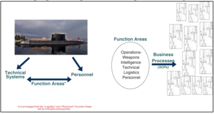 潜艇的组织结构根据技术系统和人员的“功能区域”构建。尽管各国间可能存在细微差异,但潜艇组织中的功能区域通常体现为五个主要领域。这些领域被称为“作战与武器”、“情报”、“技术”、“后勤”和“人员”,人员利用系统时遵循为潜艇这些功能区域预定义的“标准业务流程”。潜艇从事从部署前准备到部署后活动的众多业务流程;使其动态化并成为作战的组成部分。(图3)