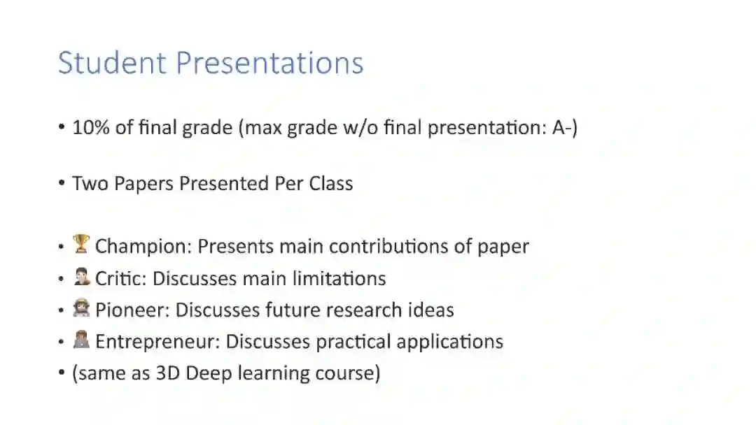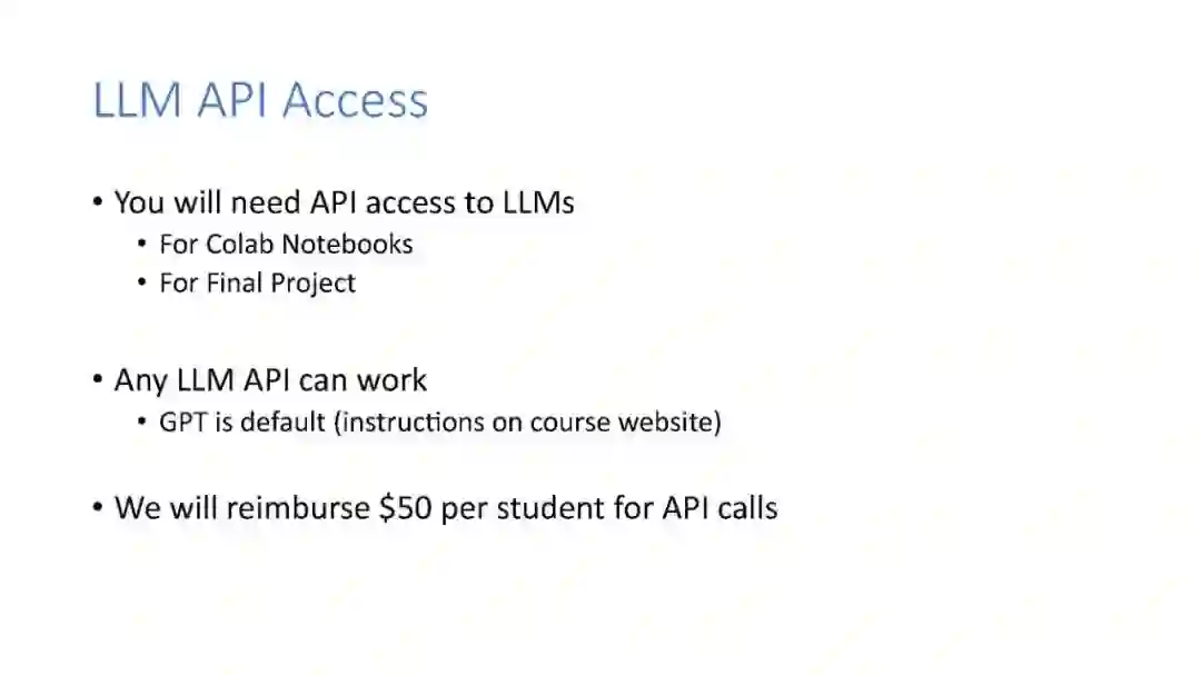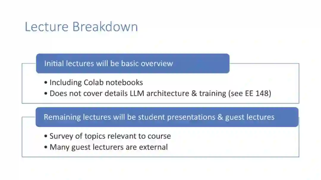 主题:用于推理的大型语言模型 大型语言模型(LLMs)是机器学习和人工智能中一项令人兴奋的新发展。本课程探索使用LLMs作为强基础模型以启用推理任务的研究方向。 本课程的目标是使学生能够: 了解各种推理任务。(讲座) 获得如何在应用程序中使用LLMs的操作理解。(Colab笔记本) 学会解构研究论文。(论文展示) 在将LLMs应用到新的推理任务时,制定挑战。(项目提案) 作为研究项目探索上述挑战。(最终项目) 对于希望更深入了解LLMs架构及其他生成式AI模型的人,应考虑选修EE 148课程。
