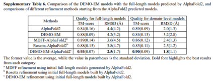 由上表所示, 虽然 AlphaFold2 预测的单个域的 TM-score (0.89) 比 DEMO-EM (0.84) 高,这可能是因为 DI-TASSER 构建的域模型质量较低,整体质量DEMO-EM 构建的全长模型(TM-score 为 0.88)优于 AlphaFold2(TM-score 为 0.84),DEMO-EM 在 28 出时获得了比 AlphaFold2 更高的 TM-score 51 种蛋白质。
