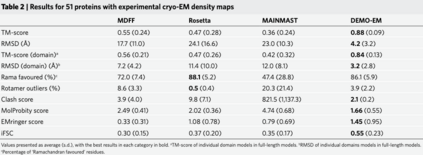 作者还将 AlphaFold2 构建的相同全长模型输入 MDFF、Rosetta 和 DEMO-EM,以检查灵活组装和细化过程的性能。所有方法都改进了初始全长模型,即使对于最佳预测模型,也显示了冷冻电镜数据的有用性。