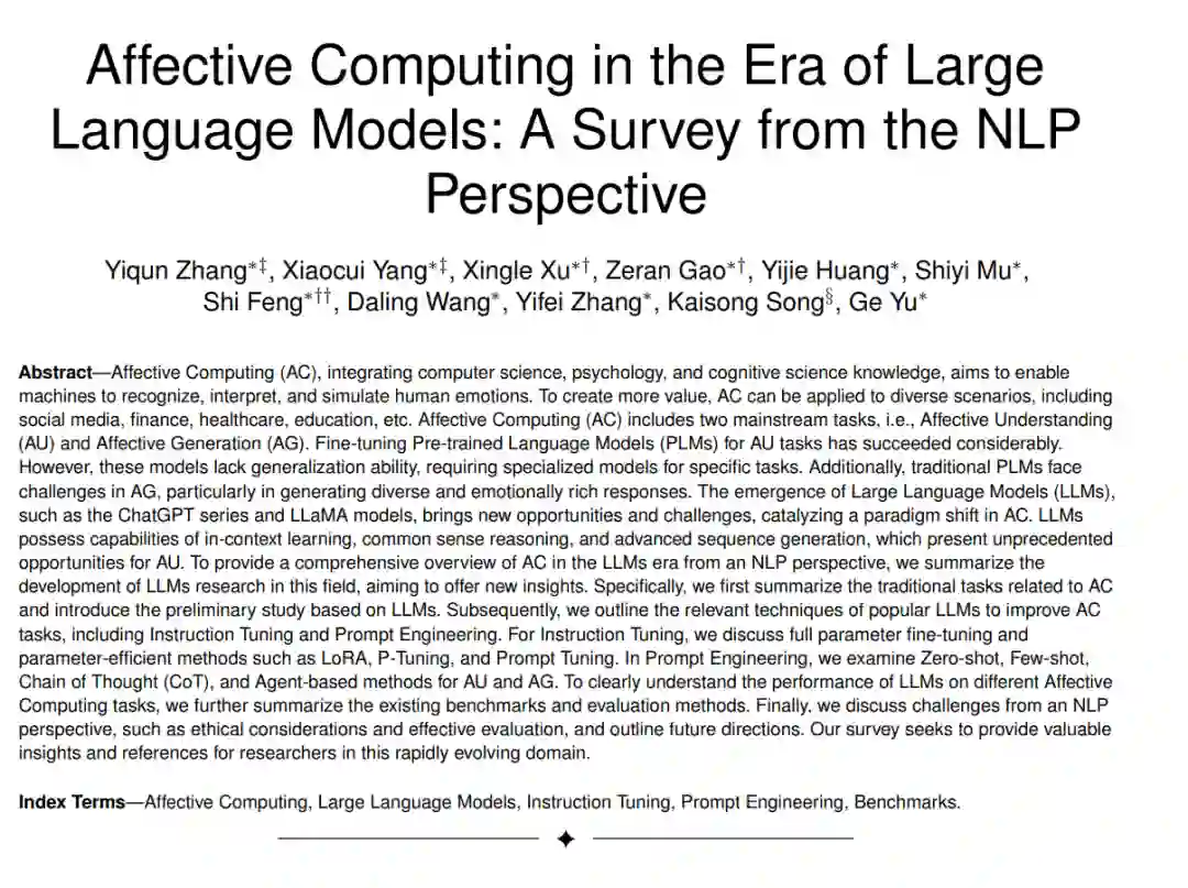 情感计算(Affective Computing,AC)集成了计算机科学、心理学和认知科学的知识,旨在使机器能够识别、解释和模拟人类情感。为了创造更多价值,AC可以应用于多种场景,包括社交媒体、金融、医疗、教育等。情感计算包括两个主流任务,即情感理解(Affective Understanding,AU)和情感生成(Affective Generation,AG)。针对AU任务进行的预训练语言模型(Pre-trained Language Models,PLMs)微调已经取得了显著成功。然而,这些模型缺乏泛化能力,通常需要为特定任务定制专门的模型。此外,传统的PLMs在AG任务中面临挑战,尤其是在生成多样化且情感丰富的回应方面。随着大型语言模型(Large Language Models,LLMs)的兴起,如ChatGPT系列和LLaMA模型,为情感计算带来了新的机遇和挑战,促使该领域发生范式转变。LLMs具备上下文学习、常识推理和高级序列生成的能力,为AU任务提供了前所未有的机会。为了从自然语言处理(NLP)角度全面概述LLMs时代的情感计算,我们总结了这一领域LLMs研究的发展,旨在提供新的见解。具体而言,我们首先总结了与AC相关的传统任务,并介绍了基于LLMs的初步研究。随后,我们概述了流行LLMs提升AC任务的相关技术,包括指令微调(Instruction Tuning)和提示工程(Prompt Engineering)。在指令微调中,我们讨论了全参数微调和参数高效方法,如LoRA、P-Tuning和Prompt Tuning。在提示工程中,我们探讨了用于AU和AG的零样本、少样本、链式思维(Chain of Thought,CoT)以及基于代理的方法。为了清楚了解LLMs在不同情感计算任务中的表现,我们进一步总结了现有的基准和评估方法。最后,我们从NLP角度讨论了诸如伦理考虑和有效评估等挑战,并概述了未来的发展方向。我们的综述旨在为这一快速发展的领域的研究人员提供有价值的见解和参考。