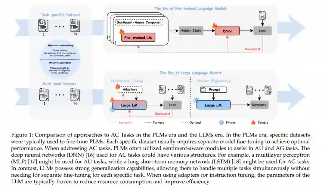 情感计算(Affective Computing,AC)涵盖了研究和开发能够通过自然语言及其他模态识别、解释、处理和模拟人类情感的系统,旨在弥合人类情感与机器理解之间的差距[1, 2, 3]。AC任务大致可分为两类主流任务:情感理解(Affective Understanding,AU)任务[4]和情感生成(Affective Generation,AG)任务[5, 6]。情感理解专注于识别和解释人类情感,包括情感分析[7, 8]、讽刺检测[9, 10]等。情感生成则涉及创建能够引发人类特定情感反应的内容或回应,以生成具有情感细微差别的表达形式,包括情感感知对话生成[11, 12]、创意内容生成等。随着大型语言模型(Large Language Models,LLMs)的出现[13, 14, 15],情感计算任务正在经历范式转变,以前所未有的方式探索和建模人类情感。 在LLMs出现之前,情感计算的主流范式是通过在标注数据集上微调预训练语言模型(Pre-trained Language Models,PLMs)[19],如BERT[20]和RoBERTa[21],以提升特定任务的表现。尽管这一训练范式在情感理解相关任务中取得了诸多成功,但其本质上仍受到人工标注数据的质量和规模的限制,难以泛化到新的领域[22]。如图1所示,LLMs研究的兴起深刻地改变了情感计算的研究范式,拓展了任务的多样性,超越了之前研究中的限制,这些研究往往集中于特定数据集和单一任务的性能提升[23, 24]。这种演变伴随着开发新方法以利用LLMs的广泛知识[25],以同时提升与情感计算相关的各种任务的表现。大型语言模型的自回归性质和大规模预训练使其在处理对话输入和生成连贯回应方面具有优势[26, 27]。 为了充分利用和增强LLMs的能力,提出了多种技术,包括指令微调(Instruction Tuning)和提示工程(Prompt Engineering)。具体而言,指令微调[28, 29]涉及在一个明确定义任务指令的数据集上微调预训练语言模型。例如,Flan-T5[28]为不同任务设计了具体的指令,如情感分析、常识推理、问答等。指令微调是一种目标明确的训练形式,旨在使模型更善于在不同领域内遵循复杂和多样的指令。另一方面,提示工程[30, 31]更注重如何设计输入以引导模型生成期望的输出,而无需修改模型本身。上下文学习(In-context Learning)可以进一步挖掘模型,根据直接在提示中提供的实例学习和应用知识,而无需对这些特定任务进行事先的明确训练[32]。虽然LLMs在各种任务中提供了新的机会并初步显示出成功,但目前尚缺乏从NLP角度对LLMs在情感计算中应用的综合评述。现有的综述要么专注于诸如情感分析等特定任务[23, 33, 34, 35, 36],要么集中于传统的非LLM方法[19, 37]。 为弥补这一空白,亟需提供一个全面的概述,说明LLMs如何在广泛的AC相关任务中应用,以及它们带来的独特机遇和挑战。因此,我们研究了LLMs在情感计算任务中的能力和局限性,涵盖情感理解和情感生成。虽然我们的重点主要是NLP,但我们也包括了以文本为中心的多模态情感计算任务,认识到在AC中整合多种模态的重要性。我们首先总结了为理解LLMs在AC中的能力和局限性奠定基础的早期研究。在此基础上,我们探讨了两项关键技术,用于将LLMs适应AC任务:指令微调和提示工程。这涉及回顾旨在提高LLMs在AC任务中表现的各种微调方法,随后探讨不同的提示策略,以期望从LLMs中引出特定的情感响应。为了提供全面的评估,我们进一步总结了用于系统性评估LLMs在AC中的表现的基准和评估方法,包括创新性地使用LLMs作为评估工具。最后,我们列出了尚待解决的挑战,并概述了有前途的未来研究方向,为这一快速发展的领域的持续演进和潜力提供了见解。 2 任务 情感计算(Affective Computing,AC)的主流任务包括情感理解(Affective Understanding,AU)[4]和情感生成(Affective Generation,AG)[5, 6]。AU和AG的主要传统任务及其相关子任务在表1中进行了总结。