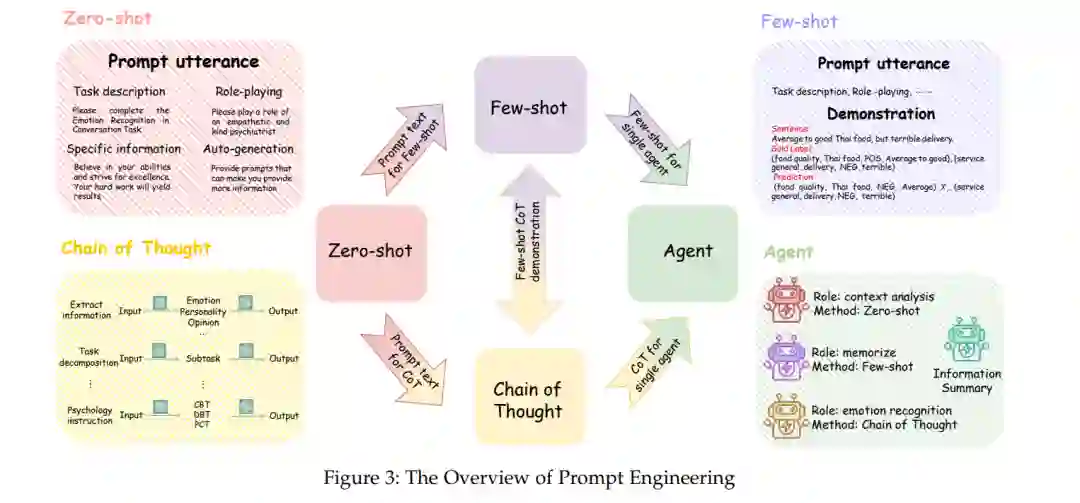 大型语言模型(LLMs)凭借其强大的理解和生成能力,为与情感计算(AC)相关的任务开辟了新途径。尽管通过预训练或监督微调(SFT)可以提升LLMs的表现,但有效利用LLMs进行AC任务仍然具有挑战性。提示工程(Prompt Engineering)[27]通过设计合适的输入提示,引导LLMs生成期望的输出,从而在AC任务中实现更高的准确性和可靠性。本节介绍了提示工程在AC领域的最新进展,重点介绍了关键技术和应用案例,以提供相关研究的参考和见解。目前的研究识别了四种主要的提示技术,如图3所示:零样本提示、少样本提示、链式思维(Chain-of-Thought,CoT)提示和代理(Agent)提示。 零样本提示(Zero-shot Prompt)[27]是一种方法,其中模型在没有任何演示或训练数据中的特定实例的情况下,生成关于特定主题或领域的文本。这种方法结构简单,易于理解,能够快速适应不同的领域和任务。通过利用模型广泛的知识和内在的推理能力,零样本提示可以有效地生成所需的文本。这使得它在需要快速生成高质量内容的应用中尤其有效,特别是在数据不足或难以获取的情况下。 少样本提示(Few-shot Prompt)[27]为模型提供了与给定任务相关的少量示例或演示。这些示例和任务描述作为提示输入,帮助模型更好地理解特定任务。模型通过学习少量示例并遵循任务指令,可以高效地进行推理并生成高质量的输出。少样本提示提高了许多复杂任务的表现,尤其在数据样本有限或数据不平衡的情况下具有优势。 链式思维(CoT)提示[147]是一种显著增强LLMs推理能力的技术。与直接提示模型生成输出不同,CoT提示方法使用逐步推理过程引导模型进行逻辑思考。此方法涉及将中间步骤显式输出,作为推理链的一部分。CoT提示使LLMs能够生成更准确且与上下文相关的响应。这在各种复杂的推理任务中非常有效,如算术、常识推理和符号推理。此外,中间步骤使用户更容易理解模型的思维过程,从而提高了LLMs推理的可解释性。 代理(Agent)[92]是一种新兴且有前途的提示工程技术。它作为一个智能代理,能够感知其环境,自主理解、做出决策并执行行动。在LLM代理中,LLM充当代理的大脑,与多个LLM组件协作完成任务的各个部分。配置文件、工具、模块、计划和行动模块根据提示方法执行各自的任务,然后LLM大脑综合各个模块的结果,以实现更好的结果。这种协作方法使代理在解决需要多个步骤或多样化知识的复杂任务时特别有效。它们通常用于需要角色扮演[92]或协调行动的场景[148],展示了它们在处理复杂多面挑战中的多功能性[149]。 尽管这些提示技术具有一些共性,但它们在特征和应用上各有不同。零样本提示方法使用句子或段落作为提示文本来引导模型,而其他三种方法在此基础上进行了各种修改和扩展。少样本提示方法在提示文本中添加了解决任务的示例以帮助完成任务。CoT提示方法采用多步骤链式思维,使用不同的提示文本在每个步骤完成任务。CoT还可以与少样本方法结合,利用CoT的多步骤思维过程作为示例来引导思维链的生成。代理方法与前三种方法不同,它采用多LLM协作的方式。每个LLM可以使用任何提示形式,如零样本、少样本或CoT,而每个LLM输出的信息则被整合以完成任务。图3展示了这四种方法的相似性和差异性。