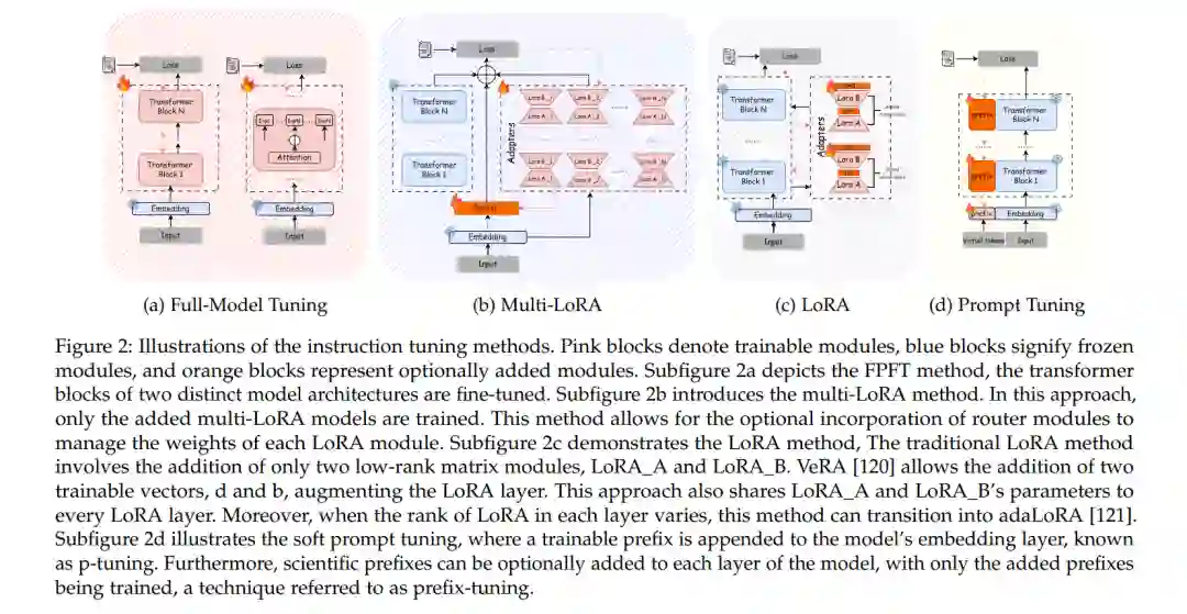 大型语言模型(LLMs)在不同任务上表现出色,如问答、序列生成等[115]。指令微调(Instruction Tuning)[116]被引入以适应LLMs在特定任务中的应用,从而在保持原始模型优势的同时,提升LLMs在专门下游任务中的性能。 由于LLMs的规模通常超过数十亿参数,对整个模型的所有参数进行全参数微调(Full Parameter Fine-Tuning,FPFT)在实践中可能并不实际。为降低模型训练成本,提出了一系列参数高效微调(Parameter-Efficient Fine-Tuning,PEFT)方法,如LoRA[117]、前缀微调(Prefix Tuning)[118]和P-Tuning[119],如图2所示。LoRA通过冻结所有原始参数,并在原始权重旁边注入一对低秩分解矩阵,减少了微调过程中需要训练的参数数量。前缀微调通过在LLM的输入序列中添加与特定任务相关的可训练“前缀”令牌作为隐式可学习提示,涉及在Transformer的每一层中插入可训练的自由向量。在情感计算任务中应用PEFT进行指令微调可以有效降低训练成本。