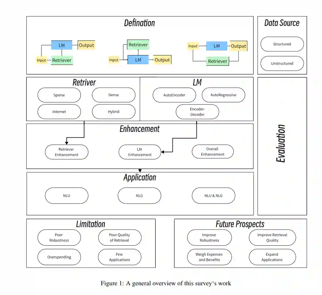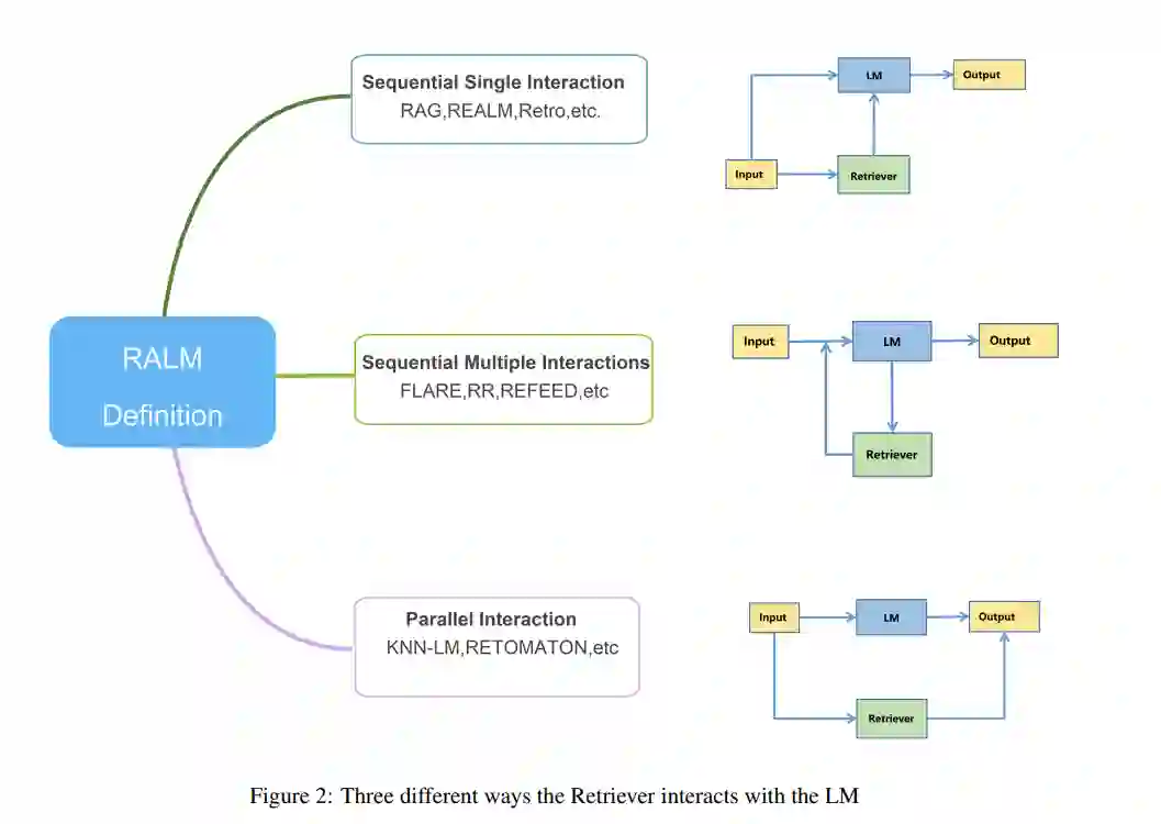 关于NLP中的检索增强方法,仅有关于RAG的综述只讲述了部分故事。不仅与自然语言生成(NLG)相关的任务需要检索增强技术,自然语言理解(NLU)任务也需要外部信息。迄今为止,全面综述NLP全谱系中应用增强检索技术的文章还很少。为了改善当前状况,本文提出以下贡献: (1) 本文不仅关注与RAG相关的工作,还重点强调了RALM,并与NLP的概念保持一致。与生成相关的工作与NLG对齐,而其余的工作与NLU对齐。 (2) RALM的两个组成部分,检索器和语言模型,都进行了详细描述,这两个组件的不同交互模式也首次被准确定义。 (3) 提供了RALM工作计划的全面概述,总结了当前RALM的常见和新颖应用,并分析了相关限制。提出了这些限制的潜在解决方案,并推荐了未来研究方向。
