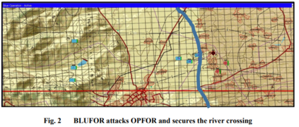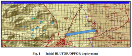 在该场景中,蓝军(BLUFOR)的目标是向东推进,穿过阿塞拜疆名为阿格达姆区的地区,同时与部署在河东的对方部队(OPFOR)交战并将其消灭。(见图 1)