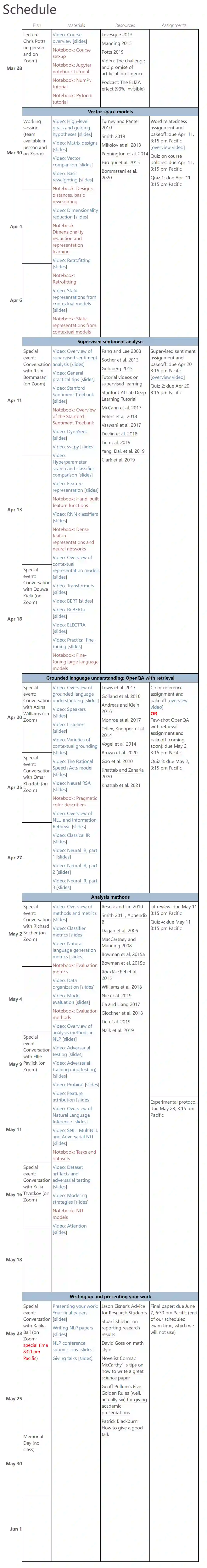 以下就是主要的课程主题了,该课程从今年 3 月份开始到 6 月份结束,囊括了自然语言理解的方方面面。每一个课程主题又会引出各种话题扩展,通过前沿论文进行讲解。该课程还提供了特别活动,允许学生与资深学者进行对话。每节课程结束,学生都有相应的作业要完成。