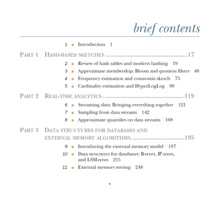 本书共分三个部分,共11章。第1部分是关于概率的简洁数据结构,第2部分是关于流数据结构和算法,第3部分是关于外部内存数据结构和算法。以下是每一章的简要总结: