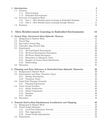 论文的第一部分集中在“具身”类环境,其中一个主体在一个类似自然世界的环境中有物理表现。我们利用这种高度结构化的环境集来设计具有快速记忆、规划和状态推断能力的整体嵌入式代理体系结构。在论文的第二部分,我们将重点放在没有强公共子结构的一般环境中应用的方法。首先,我们重新检查元学习代理与环境的交互模式:提出用一个并行执行框架来取代典型的顺序处理交互历史,其中多个智能体并行地在环境中行动。接下来,我们讨论了一个通用的和强大的序列模型的使用片段间存储器,门控transformer,展示了性能和数据效率的巨大改进。最后,我们开发了一种方法,可以显著降低(元)强化学习设置中transformer模型的训练成本和作用延迟,目的是(1)使它们在研究社区中更广泛地使用,(2)解锁它们在实时和延迟受限的应用中使用,如机器人。