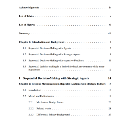 在论文的第一部分中,我们专注于重复拍卖,并设计了拍卖者可以在战略投标人存在的情况下有效学习的机制,反之,解决智能体如何在重复拍卖中投标或使用数据中毒攻击来最大化他们自己的目标。在第二部分中,我们考虑在线学习环境,其中关于学习者决策的反馈是昂贵的。本文提出一种在线学习算法,受主动学习技术的启发,可以快速前进队列中信息量更大的一小部分示例。这允许学习器获得与最优在线算法相同的性能,但仅通过查询非常小的分数的反馈。最后,在论文的第三部分,我们考虑了一个新的随机多臂匪徒学习目标,它促进了个人和群体机会的择优公平。https://smartech.gatech.edu/handle/1853/70199