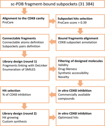 图-3 第一轮设计所得化合物库中37个代表分子的CDK 8抑制活性测试结果【总结】Didier Rognan教授团队提出了一种新的基于片段的化合物设计方法来实现靶点特异性的分子生成。相比于经典方法,该方法不需要花费大量计算成本研究片段库在口袋中的位置,而是从已经积累的大量晶体结构数据中挖掘,构建口袋特征-片段结构的配对数据。虽然该套路不是首次提出,但本文实现了深度学习方法与基于片段的药物设计的首次结合。基于深度学习方法进行口袋环境匹配和连接结构生成保证结构的合理性和新颖性,对药物设计方法的开发者具有启发作用。【参考文献】【1】Eguida, M.; Schmitt-Valencia, C.; Hibert, M.; Villa, P.; Rognan, D., Target-Focused Library Design by Pocket-Applied Computer Vision and Fragment Deep Generative Linking. Journal of Medicinal Chemistry 2022, 65 (20), 13771-13783. (DOI: 10.1021/acs.jmedchem.2c00931)【2】Desaphy, J.; Azdimousa, K.; Kellenberger, E.; Rognan, D., Comparison and Druggability Prediction of Protein–Ligand Binding Sites from Pharmacophore-Annotated Cavity Shapes. Journal of Chemical Information and Modeling 2012, 52 (8), 2287-2299.【3】Da Silva, F.; Desaphy, J.; Rognan, D., IChem: A Versatile Toolkit for Detecting, Comparing, and Predicting Protein–Ligand Interactions. ChemMedChem 2018, 13 (6), 507-510.【4】Eguida, M.; Rognan, D., A Computer Vision Approach to Align and Compare Protein Cavities: Application to Fragment-Based Drug Design. Journal of Medicinal Chemistry 2020, 63 (13), 7127-7142.