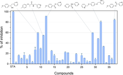 图-2 CDK8 ATP结合位点的空间特征。H表示铰链区,GA1、GA2表示门控区,SE1、SE2表示溶剂暴露区。 接下来,研究者采用深度生成模型DeLinker设计合理的连接结构。DeLinker是一种在ZINC和PDBbind数据集上训练的自动变分编码器模型,其会在连接链生成过程中考虑待连接原子间的距离和角度等限制因素。研究者使用铰链区匹H配的片段作为起点,GA1、GA2、SE2匹配的片段作为连接目标进行设计。经过连接完整性、类药性和可合成性过滤后,本轮设计共获得了114125个不同的分子,其中大部分的分子由铰链区H和溶剂暴露区SE2连接得到。为了进一步探究新分子结构在化学空间中的分布情况,研究者将分子库与ChEMBL类药库和KinFragLib激酶配体库中的分子进行比对,结果表明只有259个与ChEMBL库重复的结构,而与KinFragLib库重复的结构只有5个。计算分子指纹相似性后发现,获得分子库与两个已知数据库相似度大于0.6的比例也仅有13%和0.85%,充分说明POEM生成的结构具有独特性。 为了验证生成结构是否具有活性,研究者挑选出37个候选化合物进行CDK8抑制活性的实验测定。结果如图-3所示,6个化合物在10 μM下取得超过50%的抑制率。其中,化合物12活性最强,IC50达到376.9 nM。但是该化合物仅由铰链区H和门控区GA2连接得到,分子量较小,仍然是一类片段分子。因此,研究者在化合物12结构基础上,按同样的方法开展了第二轮基于片段的分子设计,希望获得能进一步占据SE2和GA1区域的分子结构。第二轮筛选进一步考虑了连接结构是否合适,最终研究者获得了151个新结构并选择其中6个开展合成和活性测试。从中获得的化合物49,由12与SE2定位的片段连接得到,活性达到6.4 nM。