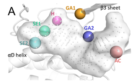 图-1 使用POEM方法设计CDK8小分子抑制剂的工作流程 研究者选择了“DFG-in”构象的CDK8 ATP结合位点作为参考口袋(PDB ID: 5HBH)并采用同样的方法以点云形式表示其特征。如图-2所示,口袋可分为铰链区、溶剂暴露区和门控区。接着,研究者使用内部开发ProCare程序【4】将来自sc-PDB的各子口袋特征分别与CDK8口袋特征进行比较,根据点云的匹配程度打分,点云的在三维空间中的比对考虑了其可旋转和平移性。除子口袋相似性外,研究者在片段库筛选过程中额外考虑了分子片段的类药性和口袋区域定位是否明确等标准,最终筛选出385个分子片段。