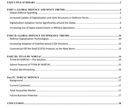 弗若斯特沙利文公司(Frost & Sullivan)于 2021 年 5 月为诺塔克防务公司(Nortac Defence)进行的一项研究表明,在 2021 年至 2026 年期间,诺塔克 TITAN 等解决方案在 20 个选定国家的市场总额为 13.9 亿美元,同期诺塔克 TITAN 的可访问市场总额估计为 2.78 亿美元。