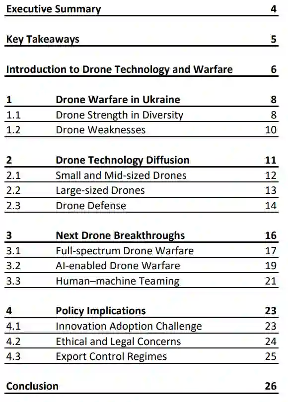 俄罗斯乌克兰战争无疑已成为了解未来无人机战争如何发展的最重要冲突。本研究报告在全面分析乌克兰战场上经过实战验证的做法的基础上,提出了九条重要启示。这些经验包括技术、理论和政策。报告的四个章节探讨了提高无人机跨职能和跨作战领域能力的主要机遇。它们还强调了伴随新型无人机系统的开发、集成和部署而持续存在的挑战。但重要的是,无人机并不是取得战略胜利或赢得战争的灵丹妙药。因此,本报告在强调人力资本的核心作用的同时,努力管理人们对无人机能力的期望。事实上,当与新的使能技术相结合时,熟练的专家就能创造出有效的无人机性能。