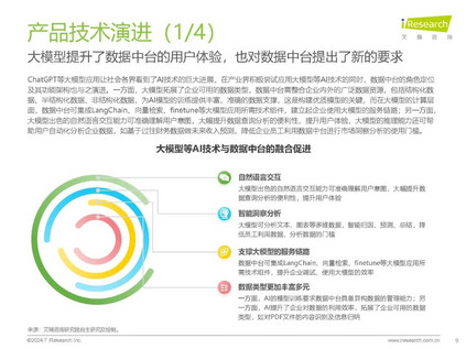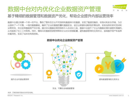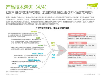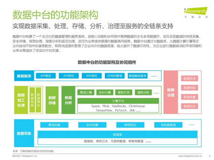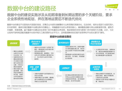数据中台的概念及本报告研究范畴 数据中台可统一企业数据资产,支撑企业业务分析与转型优化,是企业 数字化建设的重要构成 数据中台是企业数字化建设的重要构成,其通过整合企业基础设施和数据能力,实现数据资产化和服务复用,降低运营成本,支撑业务创新。数据中台通过采集、存储、加工大量数据,统一企业数据标准,建立全域级、可复用的数据中心,增强数据共享和复用,满足多方面需求。尽管部分观点认为数据中台的概念被过度炒作,但数据中台确实可为企业解决数据资产管理的问题,支撑业务分析洞察,促进业务转型优化,带来业务价值。作为企业内部统一数据能力的集合和业务数据化的承载体,数据中台对于企业数字化升级具有关键作用。 数据中台对内优化企业数据资产管理 基于精细的数据管理和数据资产优化,帮助企业提升内部运营效率 数据中台通过构建一个统一的平台,整合了散布在企业不同系统和数据库中的数据,实现了数据的融合、标准化和安全存储,为企业提供了一个可靠、一致的数据基础,确保了企业的数据质量和数据安全,使企业能够快速获取所需信息,实现信息的即时流动和决策支持,充分发挥数据资产的价值。通过优化数据处理流程和引入自动化工具,数据中台提升了企业内数据处理的速度和准确性,从而提高了员工工作效率。同时,精细化的数据资源管理帮助企业优化资源配置,避免数据管理的无效支出,提高数字资产和服务的复用性,实现了成本的有效控制。 数据中台推动企业对外产品服务创新 基于数据洞察,支撑企业产品服务创新,不断优化客户体验 数据中台不仅能对内优化数据资产管理,更能在企业对外产品服务创新中发挥重要作用。利用数据中台,企业团队能够深入挖掘客户数据、分析市场变化,基于这些洞察快速调整产品策略,精准地开发满足市场需求、符合客户预期的新产品,优化客户的购买流程,提升客户满意度和忠诚度。通过对客户行为和反馈的系统分析,数据中台支持企业设计和实施创新的服务模式,提供更加个性化和差异化的服务,并促使企业探索有数据支撑的创新商业模式,为企业开辟新的收益来源。在数据驱动下,数据中台支持企业不断优化客户体验,强化品牌吸引力,全面提升企业的市场竞争力。
