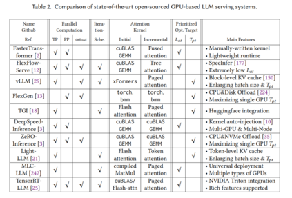 生成型LLM服务需要一系列优化,许多最新工作已经开始开发软件框架,以提供高效的LLM推理部署服务。下面,我们将重新审视这些系统,并对几个代表性的开源GPU基础上的LLM服务系统进行全面分析,如表2所示。这些分析不包括一些流行的相关项目,包括1) 专门针对其他硬件的解决方案(例如,PopTransformer[17]、CTranslate2[8]、lammap.cpp和ggml[14])和2) 构建在其他系统之上的部署解决方案,如OpenLLM[26](vLLM)、xinference[30](ggml + vLLM + xFormers)、LMDeploy[20](FasterTransformer)、gpt-fast[15](PyTorch)、DeepSpeed-MII和DeepSpeed-FastGen[11](DeepSpeed-Inference)以及RayLLM和RayServe[27](vLLM)。