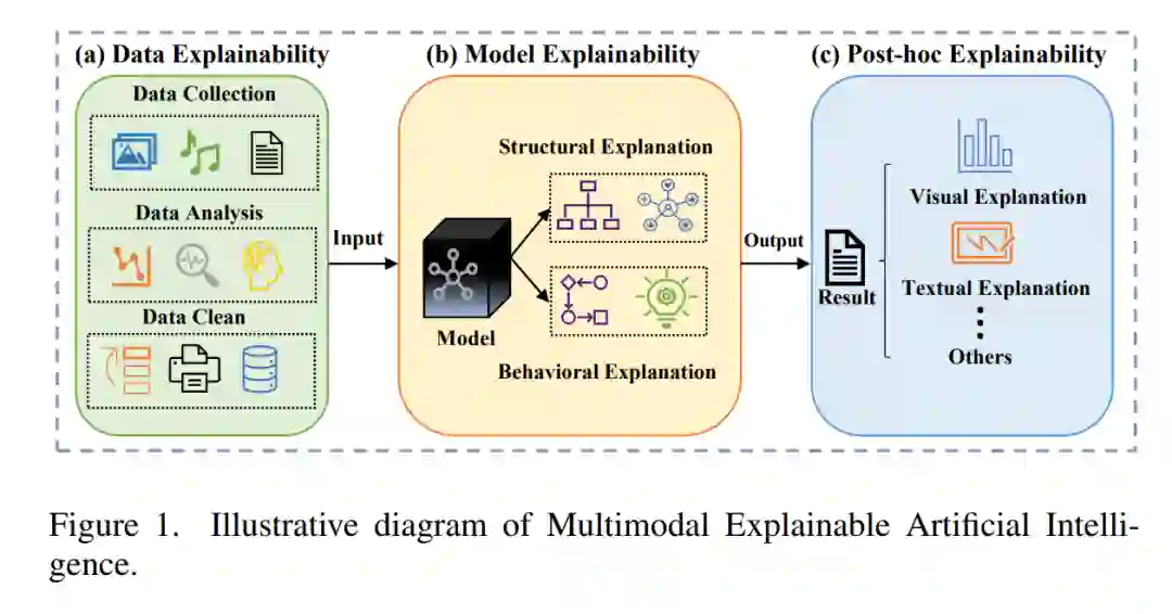 人工智能(AI)的进展对计算机科学产生了重大影响,如Transformer [1]、BLIP-2 [2] 和 ChatGPT [3] 在自然语言处理(NLP)、计算机视觉和多模态任务中表现出色,通过集成多种数据类型。这些相关技术的发展推动了具体应用的进步。例如,在自动驾驶中,系统需要整合来自不同传感器的数据,包括视觉、雷达和激光雷达(LiDAR),以确保在复杂道路环境中的安全运行 [4]。类似地,健康助手需要具备透明性和可信度,以便医生和患者都能轻松理解和验证 [5]。理解这些模型如何结合和解释不同模态对于提升模型可信度和用户信任至关重要。此外,模型规模的不断增大带来了计算成本、可解释性和公平性等挑战,推动了可解释人工智能(XAI)的需求 [6]。随着包括生成式大型语言模型(LLMs)在内的模型变得越来越复杂,数据模态也更加多样化,单一模态的XAI方法已无法满足用户需求。因此,多模态可解释人工智能(MXAI)通过在模型的预测或解释任务中利用多模态数据来解决这些挑战,如图1所示。我们根据数据处理顺序将MXAI分为三种类型:数据可解释性(预模型)、模型可解释性(模型内)和事后可解释性(模型后)。在多模态预测任务中,模型处理多个数据模态,如文本、图像和音频;在多模态解释任务中,利用多种模态来解释结果,从而提供更全面的最终输出解释。