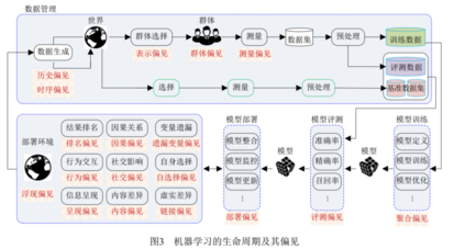 Friedman 和 Nissenbaum 首先开展了偏见相关 方面的研究,给出了计算机系统中偏见分析的一个 框架,并结合应用案例进行了阐释[8]。Baeza-Yates 从数据、算法和用户交互等方面对网页生态系统中 的相关偏见进行了定义和剖析[57]。Olteanudeng 等 分析了数据平台及其相关技术特征,从产生的来源 和表现的形式,阐述总结了社交数据相关的偏见 [58]。Sures 和 Guttag 从数据生成、模型开发及部署 两阶段出发,定义和分析了机器学习中可能存在的 五种偏见[57]。本文从机器学习生命周期中所含的数 据管理、模型训练、模型评测、模型部署等阶段出 发[59],对各个阶段中存在的偏见进行了梳理(参见 图 3)。下面从数据、算法和人机交互三个方面(图 4),对机器学习中的主要偏见进行分类介绍和讨 论。