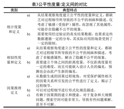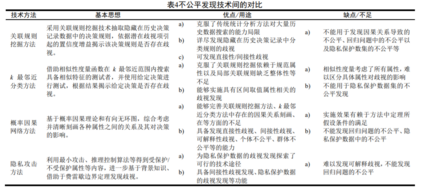 发现机器学习的不公平是纠正偏见和消除歧 视的前提。歧视类型和偏见类别的概念定义为发现 不公平提供了不同视角下的可能技术路径。机器学 习中不公平发现的主要技术包括关联规则挖掘、k 最邻近分类、概率因果网络、隐私攻击和基于深度 学习的方法等。表 4 对不公平发现技术进行了对比。