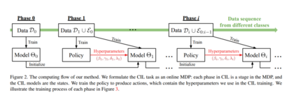 类增量学习(class incremental learning, CIL)旨在在类别数量逐步增加的情况下训练分类模型。CIL模型面临的一个内在挑战是稳定性与可塑性的权衡,即CIL模型既要保持稳定性以保留旧知识,又要保持可塑性以吸收新知识。然而,现有的CIL模型都不能在不同的数据接收设置中实现最佳权衡——通常,从一半开始训练(TFH)设置需要更大的稳定性,但从头开始训练(TFS)需要更大的可塑性**。设计了一种在线学习方法,可以在不知道先验设置的情况下自适应地优化权衡。**首先引入了影响权衡的关键超参数,例如知识蒸馏(KD)损失权重、学习率和分类器类型。然后,将超参数优化过程建模为一个在线马尔可夫决策过程(MDP)问题,并提出了一种具体的算法来求解该问题。本文采用局部估计奖励和经典bandit算法Exp3[4]来解决将在线MDP方法应用于CIL协议时存在的问题。所提出方法在TFH和TFS设置中不断改进表现最好的CIL方法,例如,与最先进的[23]相比,在ImageNet-Full上将TFH和TFS的平均精度提高了2.2个百分点。