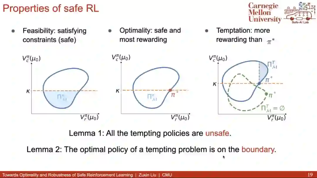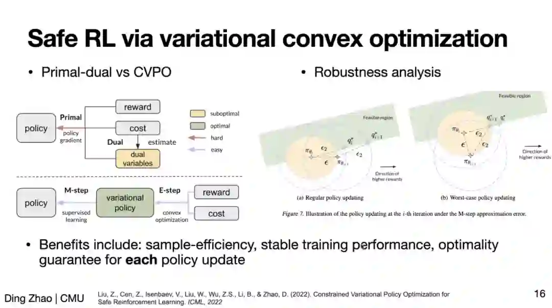 进一步地,为了获得一个安全的任务策略,目前主要的范式是通过安全强化学习(Safe RL)。然而,Safe RL 的主流方法之一——基于拉格朗日对偶的方法——对超参(如拉格朗日乘子的学习率)很敏感,更新不稳定。为此,赵老师介绍了基于变分凸优化的 Safe RL 方法,该方法将用 E-M 更新取代了拉格朗日优化。其中 E-step 通过一个凸优化过程更新变分策略,M-step 则通过监督过程更新目标策略。实验结果表明,该方法取得了更好的样本效率(sample-efficiency)和更稳定的训练过程。