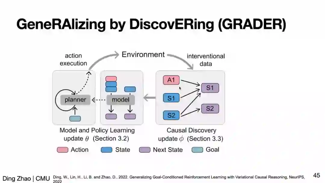 此外,赵老师还介绍了实现可泛化策略的另一途径:学习任务蕴含的本质因果关系(causal relationship)来帮助策略学习。随后,赵老师简单介绍了近期发表于 CoRL、NeurIPS 的系列工作,这些工作表明因果学习能显著帮助 RL 学习可泛化的策略、解决 RL 中的组合泛化性问题等。