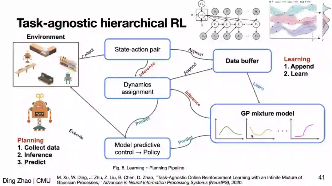 可信赖智能应当能应对变化丰富的场景,例如自动驾驶策略应该能应对每天不同时段的车况,这就要求 AI 策略要有很强的泛化性。在泛化性方面,赵老师首先介绍了基于分层强化学习(Hierarchical RL)的方法,它的底层可以自动学会任务不同场景下的策略,因此遇到新场景时,它也将自动切换为对应场景的策略从而实现泛化。
