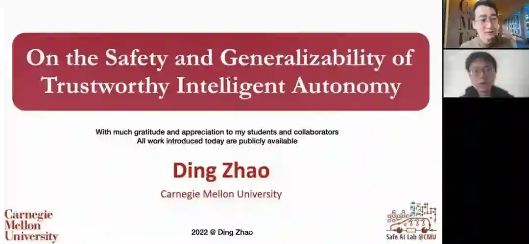 2022年12月23日,美国卡耐基梅隆大学智能安全实验室(CMU-Safe AI Lab)的副教授赵鼎博士受邀带来题为“On the Safety and Generalizability of Trustworthy Intelligent Autonomy”的在线报告。报告由中心助理教授董豪老师主持,相关内容通过蔻享学术、Bilibili 同步直播,线上数百人观看。