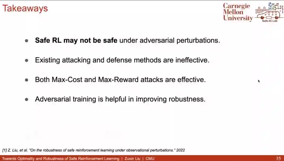 然而,更稳定的训练并不意味着策略对观测的噪声是足够鲁棒的。为此,赵老师继续介绍了在提升 Safe RL 鲁棒性方面的工作。对抗训练是被广泛采用的提升策略鲁棒性的方法,但是传统的对抗攻击在 Safe RL 场景并不那么有效:当策略受攻击性能降低的同时,往往也因不够激进而变得安全了。因此,该工作找到了在 Safe RL 场景下足够有效的攻击方法,并通过对抗训练,获得了显著鲁棒的策略。