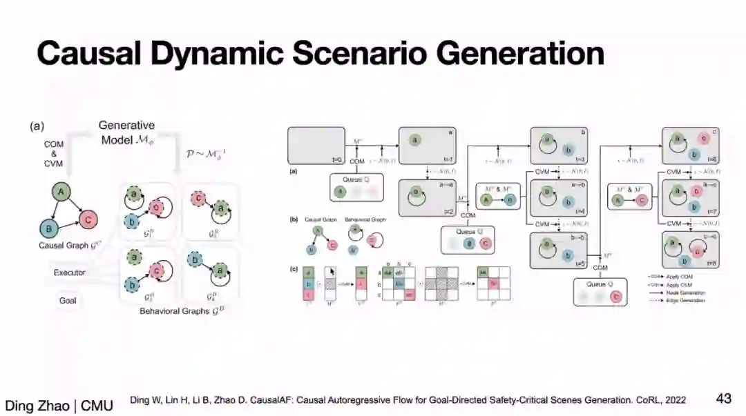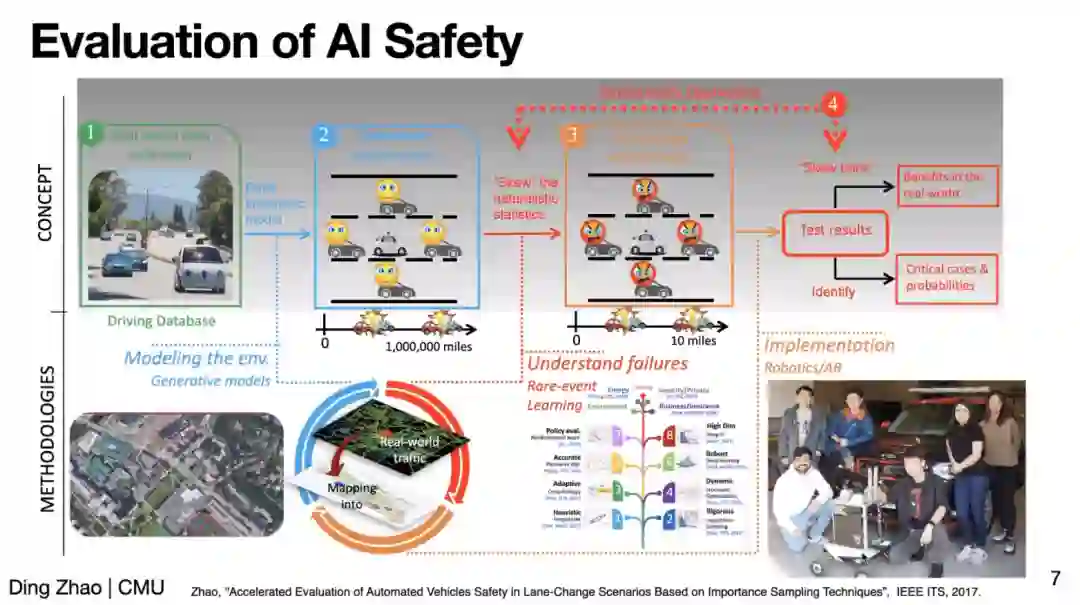 在安全性(Safety)方面,赵老师先以无人驾驶场景为例介绍了如何高效评估 AI 策略安全性能的工作。赵老师指出,无人驾驶场景中的危险事件是稀疏(rare)的,例如北美可能平均100万英里才会发生一次车祸。为了高效地评估(evaluation),赵老师提出加速环境(accelerated environment)基于 importance sampling 增加危险事件的密度,从而高效地获得和实际环境中等价的结果。