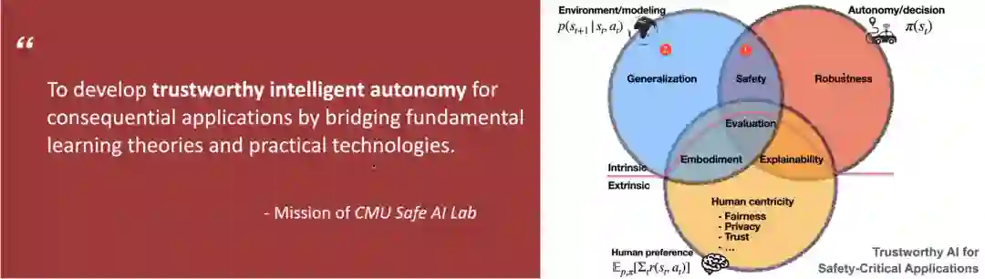 左:Safe AI Lab实验室的研究目标。右:赵老师在可信赖智能(Trustworthy AI)上的研究方向。