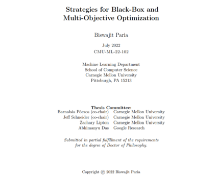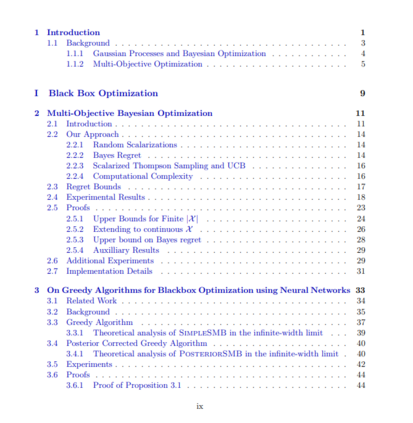 **本文的前半部分是关于昂贵函数的BBO。**首先,基于随机扩展的思想,提出了一种简单而灵活的多目标黑盒优化方法。我们引入了多目标后悔的概念,并表明随着预算的增长,我们的策略实现了零后悔。接下来,我们研究了神经网络对昂贵BBO的有效性。我们证明了一个简单的贪心方法可以达到接近高斯过程贝叶斯优化的性能。利用最近研究的高斯过程和非常广泛的神经网络训练动态之间的联系,我们证明了我们提出的算法的遗憾的上界。最后,我们提出了一个考虑成本的贝叶斯优化框架,该框架考虑了每次评估的成本。这种方法在评估成本随输入域而变化的环境中很有用,低成本评估可以提供关于最大值的大量信息。