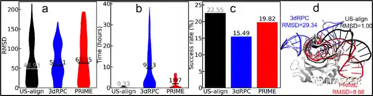 由于US-align既适用于核酸又适用于蛋白质,并且对所用的分子类型都使用统一的打分函数,因而特别适用于基于模板的RNA-蛋白结构比对。具体而言,对于一对输入的蛋白质和RNA单链结构,US-align可以搜索已有的RNA-蛋白复合物结构数据库,并且将输入的单链结构重合到复合物模板结构上,从而构造出输入蛋白与输入RNA之间的完整复合物结构。相比于已有的基于模板的比对程序(PRIME)和不依赖模板的程序(3dRPC),US-align的比对成功率提高了3到7个百分点,并且速度是已有程序的6到28倍(图5)。