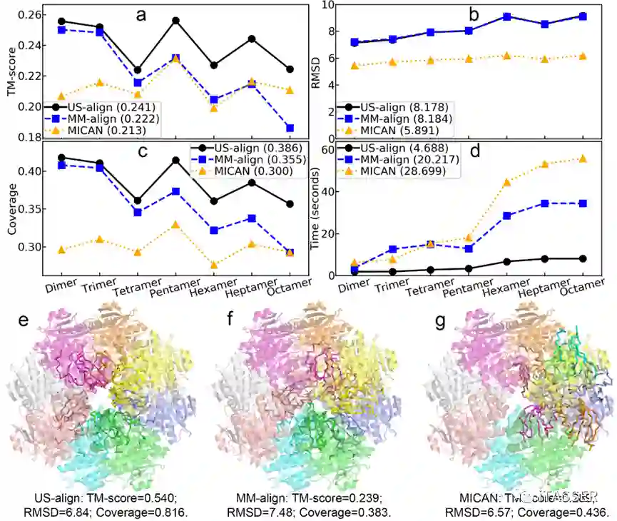 图****3 US-align与已有的复合物结构比对算法(MM-align和MICAN**)在a, TM-score、b, RMSD、c, 覆盖率和d, 运行时间四方面的比较。e, US-align、f, MM-align与g, MICAN对两个八聚体复合物比对的结果,两个复合物PDB编号4JHM和4IAJ,分别由半透明卡通和实线彩带表示,不同颜色表示不同链。**