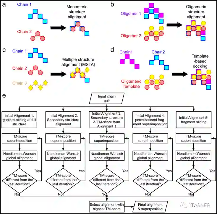 **图2 a-e, US-align实现的主要功能,包括****a,****单链结构的两两比对;****b,****复合物结构的两两比对;****c,****多条单链结构的多重比对;****d,**基于模板的结构比对。e, US-align两两结构比对的递推流程图。(图源:Zhang C, et al., Nat Methods, 2022)