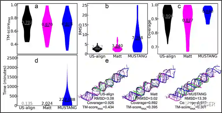 图****4 US-align**、Matt和MUSTANG在RNA多重结构比对上的比较。(图源:Zhang C, et al., Nat Methods, 2022)**