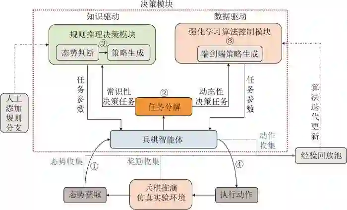 (1) 知识驱动方法 传统的智能决策主要过程为感知当前任务状态,在可行的动作空间中,对满足既定目标的动作做出响应,从而达到新的任务状态,然后继续进行下一阶段的决策。当前,基于知识的智能决策方法主要有4种:基于STRIPS和PDDL的经典规划、基于HTN的层次任务网络、基于JADE的案例推理和基于BDI的过程推理等。基于规则的兵棋推演智能体的设计主要基于人类兵棋玩家经验形成的知识库,从而实现智能体的动态决策。基于规则的兵棋智能体设计的通用模型框架是OODA决策框架[41],即观察、判断、决策和行动。自2017年国内举办各类兵棋推演大赛以来,大部分参赛团队设计的智能体还是以规则AI为基础,通过对规则AI进行多次迭代优化设计来参加比赛。基于规则AI通常存在一些局限性,如智能体的通用性比较低,但是它的设计过程往往比较简单,并且具有较强的可解释性。目前大多数兵棋智能体都是基于规则知识设计的,即以人类推演的历史经验进行战法总结,通过行为树、有限状态机等框架实现智能体动态决策。 (2) 数据驱动方法 随着AlphaStar、AlphaDogFight等人工智能程序取得的巨大成功,以深度强化学习为基础的策略迭代方式成为了目前智能决策领域的主流技术。李琛等[42]将A3C算法引入兵棋推演中的智能体开发设计,在简单想定(对称态势,双方作战单元为坦克加战车)进行了实验并取得了不错的效果。张振等[43]将PPO应用于兵棋智能体开发设计,并与监督学习结合在智能体预训练的基础上进行了优化,在六角格兵棋环境中实现了策略的快速收敛。尹奇跃等[44]将强化学习和自博弈技术相结合实现了联合策略的学习,它能够同时维护多个不同参数的智能体,使得智能体能够保持多样性,这在一定程度上解决了智能决策过程中存在的策略非传递性问题。施伟等[45]使用深度强化学习技术在“墨子”兵棋系统中进行了多机协同空战的研究,最终模型涌现了多种人人对抗过程中常见的战术战法,如多机自主编队协同对抗、自主机动快速避弹、S型诱骗敌方弹药战法等。梁星星等[46]基于兵棋平台,设计了支持多机并行的行动策略智能学习框架,针对兵棋推演样本数据利用率低,策略收敛速度慢等问题设计了基于预测编码的样本自适应行动策略智能规划框架,提高了对战场态势的感知能力,改善了策略训练效率。(3) 混合驱动方法 基于知识的智能体具有较强的可解释性,但是受限于设计者的经验水平。基于学习的智能体不依赖人类玩家的推演经验,可以通过大规模的对局次数来学习到不同态势下最优的行动策略,具有超越专业兵棋玩家的潜力。部分研究人员将上述两种智能体设计方法归纳为知识驱动和数据驱动方法。蒲志强等[47]分析两种设计方法的优缺点和知识数据协同驱动的可能性方案(架构级协同和算法级协同)。基于规则的设计方法擅长在特定想定中处理兵棋推演过程中前期排兵布阵的问题,该阶段还未发生对抗,无法产生单元损失得分奖励,此时无法通过学习的方式学习到有效策略。基于学习的方法在中后期对抗过程中具有很大的优势,该阶段奖励频繁发生变化,智能体可以通过状态-动作-奖励信息快速学习到有效的策略。黄凯奇等[48]提出了一种融合知识与数据的人机对抗框架,该框架基于OODA理论为基础,提炼出了兵棋智能决策过程中的关键阶段和问题,并认为不同的问题可以通过拆解的方式分别使用基于规则和基于学习的方法进行求解。典型知识与数据混合驱动的兵棋推演框架如图3所示。 战略博弈推演分析方法