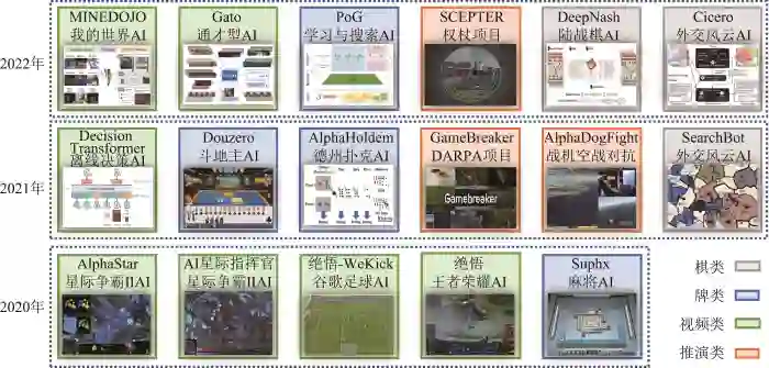 作为人工智能领域的果蝇,机器博弈(也称计算机博弈)是测试人工智能水平的天使标准。近些年,智能博弈求解技术突飞猛进,在DOTA2、星际争霸、德州扑克、西洋陆军旗等游戏环境中击败了人类。2022年11月,Meta公司研究团队在《科学》杂志上发表论文[5],声明在一款“外交风云”战略博弈棋类游戏中表现出优异水平,AI智能体通过对话理解意图,学会了谈判和欺骗[6]。2022年12月,DeepMind公司在《科学》杂志上发表的AI智能体DeepNash在西洋陆军棋中达到了专业级人类玩家水平[7]。人工智能赋能的机器博弈AI技术发展极大吸引了美军相关智能指控项目的开展。 在军事指控领域,2018年DARPA启动“面向复杂军事决策的非完美信息博弈序贯交互”(serial interactions in imperfect information games applied to complex military decision-making, SI3-CMD)项目,研究信息不完整情况下的博弈问题。2019年,美空军实施了“Alpha Dogfight”试验,旨在挖掘空战领域的新颖自主化和智能化作战决策方案,空军开展“空战演进”(air combat evolution, ACE)项目,开发可信、可扩展、人类水平、AI驱动的空战自主博弈能力。2020年DARPA开展了针对“敌方战术的建设性机器学习作战”(constructive machine learning battle for enemy tactics, COMBAT)项目[8],利用自然语言处理、非结构化文本提取,博弈论与强化学习等方法学习生成应对美军的行动方案,旨在为仿真环境提供敌军旅级兵力行动策略模拟。2020年5月,DARPA通过其官网宣布“打破游戏规则”(Game Breaker)人工智能探索项目,旨在开发程序AI并将其应用于现有任务级兵棋中,以打破复杂的模型所造成的不平衡。2021年11月,美空军发布了“今夜就战”(Fight Tonight)项目[9],尝试利用仿真环境与人类指导生成大量备选行动计划,旨在利用人工智能技术构建、演练和评估空中作战计划。2021年9月,美国国防科学委员会发布了关于美军一直在开展的“战略博弈推演-战役建模与分析-试验与学习-训练-数字工程”(gaming, exercising, modeling and simulation, GEMS)的相关报告[10],探索如何在人工智能赋能的多域战场中提升军事作战与辅助决策能力。2022年1月,美军启动了“权杖”(SCEPTER)项目[11],全称为用于弹性计划、战术与实验的战略混沌引擎,目标是利用人工智能开发作战人员的助理,为战役级战争开发机器生成的战略计划。2022年6月,DARAPA启动了SHADE人工智能探索项目[12],将使用外交的智能体、模拟(博弈)环境来训练和评估全自动人工智能谈判智能体,这些谈判代理能够处理复杂的多方交互,包括欺骗、勾结、分析和其他现实世界的特征。人工智能在智能博弈领域的关键里程碑如图1所示。