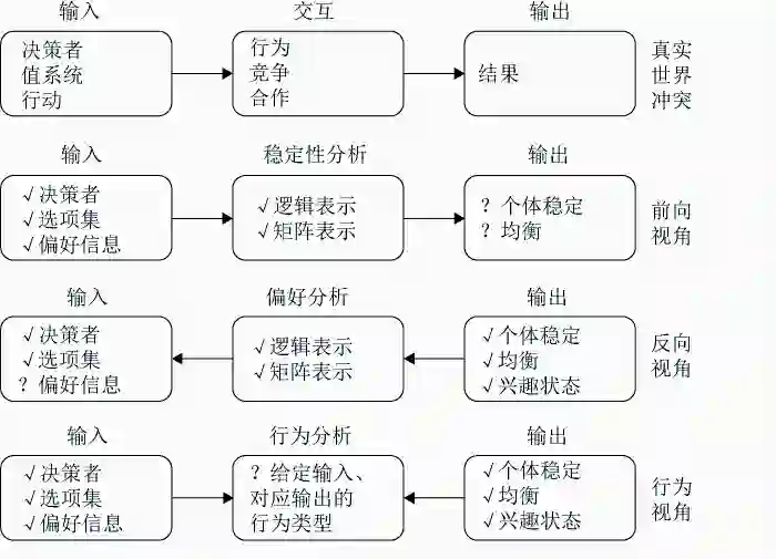 场景分析(Scenario Analysis)、假想敌机制和模型模拟工具是净评估的常用方法[50],其中情景分析法通常“如果-怎样”的方式,分析各种假设、推演各种可能的结果。娄伟[51]对情景分析方法做了区分:定性与定量情景分析,演绎与归纳情景分析,前推式与回溯式情景分析,预测性、探究性与预期性情景分析,描述式与规范式情景分析,基准与可选择性情景分析等。为保持情景内部的一致性,一些研究提出利用形态分析(Morphological Analysis)来构建情景分析框架[52]。 (2) 战略兵棋推演 战略兵棋主要对战争层面主要因素进行模拟,可用于辅助国家领导层的决策、国家安全及军事战略的检验等,参与主体是国家或军队战略层的决策人员,推演问题主要包括国际冲突,政治、经济及外交政策,军事力量建设与运用,军事行动中战争计划的制定等全局性问题。“兰德战略评估系统”主要包括自动化兵棋推演、基于规则建模、结构化兵力分析与作战行动建模四部分,将兵棋推演与仿真建模融合[30],可用于国家政策层面的战略规划、多国联合军事演习和军事理论创新。 (3) 群体决策方法 20世纪80年代钱学森等提出了利用综合集成研讨厅来解决开放复杂巨系统的方法论。综合集成方法采用“以人为主、人机结合,定性定量结合”的方式,为专家提供交互启发的研讨平台环境,将来同领域专家的智慧集成起来,实现“1+1>2”的涌现效果。赵晓哲等[53]提出利用综合集成方法研究军事系统问题,王丹力等[54]综述分析了综合集成研讨厅体系的起源、发展现状与未来趋势,郑楠等[55]分析了综合集成研讨中人-机结合的3个层次(初等结合、人机协同、人机融合)。 为了充分发挥多个领域不同专家的优势,一些研究分析了群体规模更庞大时的大群体决策问题。由于有众多决策者的参与,每个决策主体会根据自身的立场给出备选方案及偏好倾向,为了保证决策因素考量的全面性、决策条件更加实际同时提高决策科学性,需要将多个个体的决策判断及偏好集结为大群体的判断及偏好,形成关于备选方案的最佳选择。当前围绕大群体决策的相关研究可区分为三大类:多属性大群体决策方法(偏好表达形式、权重确定方法、偏好聚类方法、偏好集结方法等),冲突性大群体决策方法(冲突测度、冲突消解、决策主体行为等),风险性大群体决策方法(偏好风险、后悔与前景等心理行为、证据推理及语言挖掘等)[56],其中基于前景理论的相关研究为风险认知、鲁棒决策提供了理论指引[57]。 (4) 博弈分析方法
