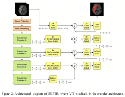 在Hatamizadeh等人的一项研究中,开发了一种基于Transformer的UNETR(UNet Transformer)架构,通过克服UNet的局部相关性限制,实现3D医学图像分割。它具有基于ViT的编码器,有效地捕获输入体积的多 Scale 全局信息。为了计算最终语义分割输出,编码器通过跳接连接直接链接到不同分辨率的解码器,通过跳接连接,类似于U-Net。