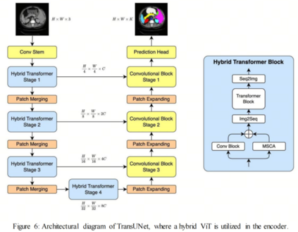 最近研究中最常见的趋势是将HVTs集成到编码器阶段。TransUNet在其编码器阶段使用HVT架构,在解码器阶段使用级联上采样器[94]。它结合了ViT和U-Net的优势,捕捉输入图像中的局部相关性和长期关系,以获得准确的分割结果。Wang等人提出了一种名为TransBTS的分割架构,将ViT和3D CNN分别用于获取全局上下文信息和局部细节[95]。它处理3D医学体积数据,以捕捉图像切片中的局部相关性和长期依赖关系。TransFuse利用了一个双融合模块来结合其编码器和解码器分支,分别是CNN和ViT架构[96]。
