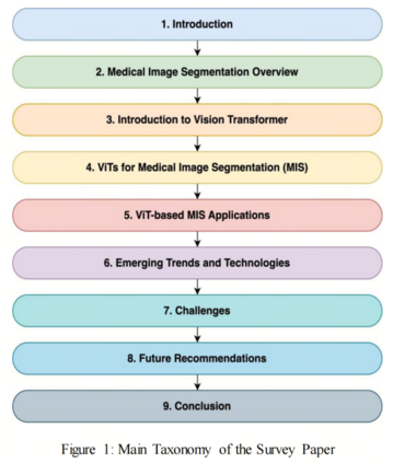 医学图像分割在各种医疗保健应用中起着关键作用,可实现准确诊断、治疗计划和疾病监测。近年来,视觉 Transformer (ViTs)作为一种有前景的技术,用于解决医学图像分割的挑战。在医学图像中,结构通常高度互连和全局分布。ViTs利用其多 Scale 注意机制来模拟图像中的长程关系。然而,它们确实缺乏与图像相关的归纳偏见和翻译不变性,这可能会影响它们的性能。近年来,研究人员提出了一些将卷积神经网络(CNNs)纳入其结构的ViTs基方法,称为混合视觉 Transformer (HVTs),以捕获图像中的局部相关性,并捕捉图像中的全局信息。本文详细介绍了ViTs和HVTs在医学图像分割方面的最新进展。除了对ViTs和HVTs基医学图像分割方法的分类外,作者还概述了它们在几种医学图像模式中的实时应用。本文可作为研究人员、医疗保健从业者和学生的有益资源,以了解基于ViTs的医学图像分割的最新方法。