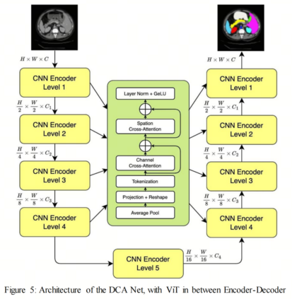 李等人提出了一种基于ViTs的ATTransUNet架构,该架构利用自适应 Token 。在他们模型中,ViTs被集成到跳接连接[90]中。他们使用自适应 Token 提取模块(ATEM)在编码器中提取图像中最有判别力的视觉 Token 。这导致复杂性降低和性能增强。 在解码器架构中,他们采用了一种选择性特征强化模块(SFRM)来关注最具有贡献的特征。 双交叉注意力(DCA),这是一种简单但强大的注意力模块,可改进U-Net基础架构中的跳接连接,用于医学图像分割,由Ates及其同事提出[91]。通过从多 Scale 编码器获得的特征建模信道和空间关系,DCA在编码器和解码器特征之间建立了语义鸿沟。DCA首先使用通道交叉注意力(CCA)和空间交叉注意力(SCA)模块来建模信道和空间关系。最后,将编码器特征上采样以对应解码器的相应层。