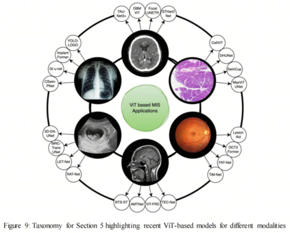 作者详细介绍了这些方法,并对其在各种医学图像模式中的实时应用进行了概述。本文可能对研究人员、临床医生等在理解基于ViTs的医学图像分割的最新方法方面具有很大的价值。 CNNs在医学图像分析中经常被用于各种应用,如肿瘤检测[54, 55],COVID-19检测[56],皮肤病变检测[57],以及分割[58]。然而,由于其感受野有限,CNNs可能难以学习显式的长程依赖性[59]。相比之下,基于ViT的医学诊断系统可以捕获大的感受野,并在各种医学图像相关任务上表现出卓越的性能[60]。 已经开发了许多基于ViT的医学图像模式系统,包括:
